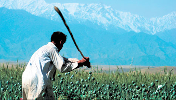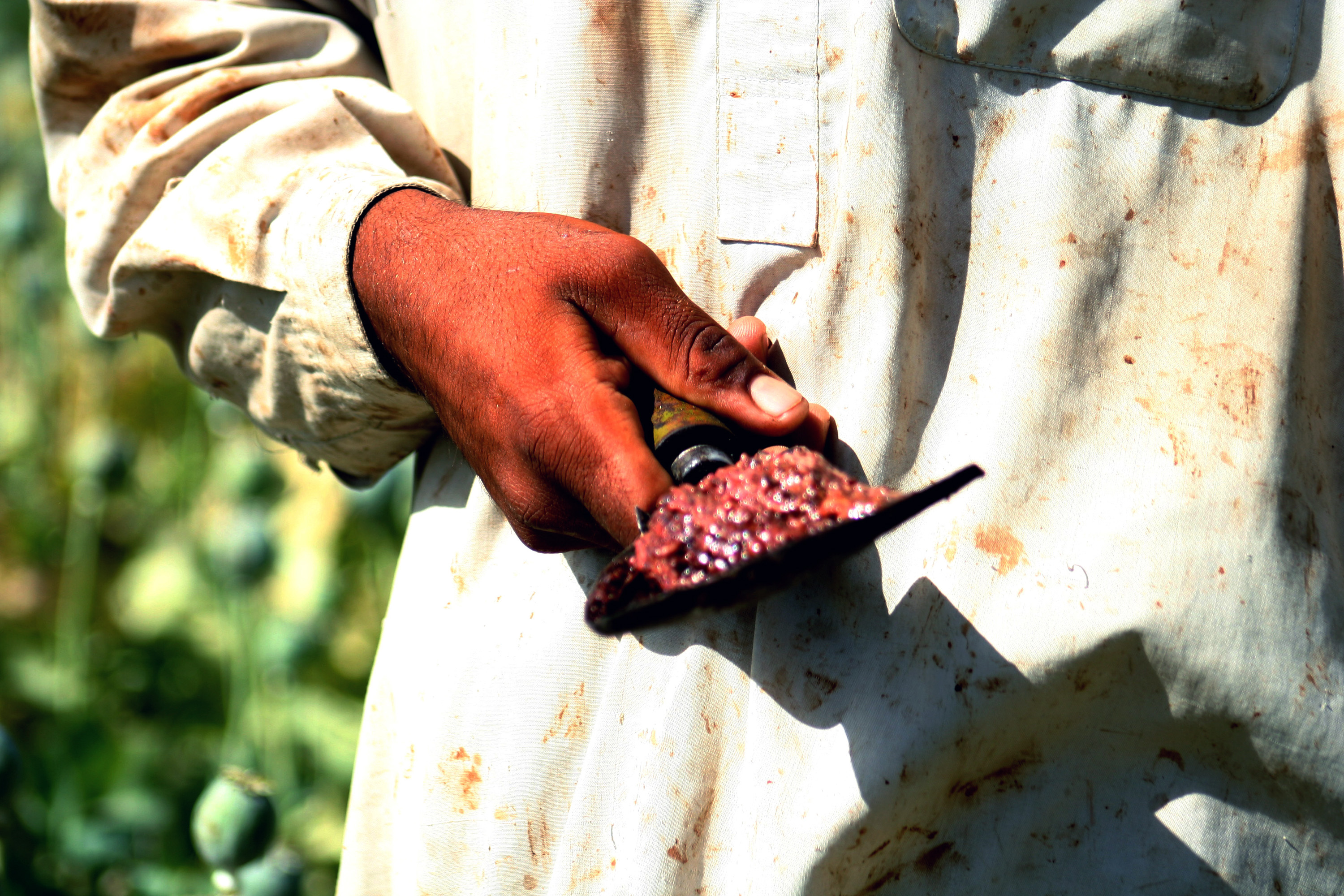 한 아프간 농부가 수확한 양귀비 열매에서 채취한 붉으스름한 생아편 즙을 들어 보이고 있다. 농민들은 수확기에 이렇게 긁어 모은 생아편을 밀수조직에 넘겨 얻은 수익으로 한해살이를 한다. (Photo by Lee, Yu-Kyung)