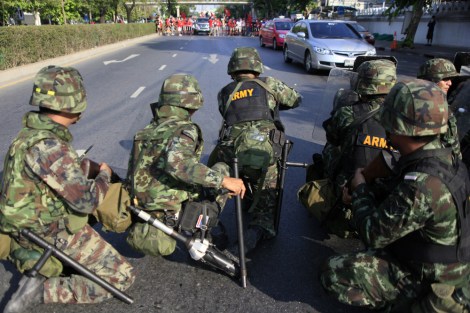 Thai military were gearing up to crackdown on anti-government 'red shirts' protesters on April 10. The crackdown has caused deadly clashes to kill 24 and wounded more than 800. (Photo by Lee Yu Kyung)