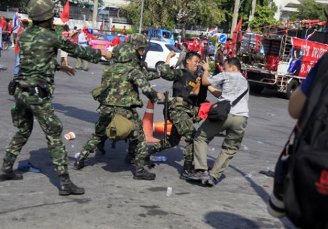 » 4월10일 방콕의 유혈사태는 타이 현대사에서 ‘암흑의 날’로 기록될 것이다. 방콕 시내에서 진압에 나선 군이 시위 참가자 한 명을 폭행하고 있다. 이 시위대는 군인들이 탱크와 M16 소총으로 시위대를 위협하며 밀어붙이자 한 군인의 총을 뺏으려다 충돌을 빚었다 (Photo by Lee Yu Kyung)