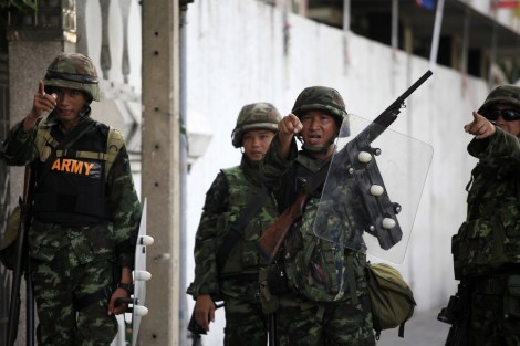 The army were deployed in ‘ready-to-shoot’ position at Phitsanulok road near government house, after they controlled the road by clearing off anti government red shirts protesters. (© Lee Yu Kyung 2010)