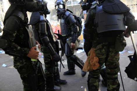 Security forces were all geared up to confront with red shirts protesters on April 10. (© Lee Yu Kyung 2010)