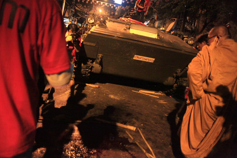G_Red.crackdowned_100410(8)_smM Published May 10, 2010 at 1000 × 667 in Photo story : Towards democracy or civil war (1) ← Previous Next → Red shirts protesters and monks were looking at blood stains in front of tanks, which were abandoned by armed forces at Din So road after deadly clashes between security forces and red shirts protesters. (Photo by Lee Yu Kyung)
