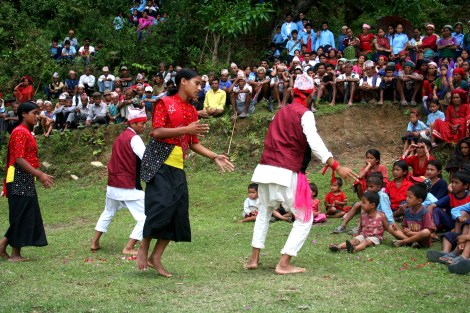 마오이스트 문화선전단이 마을 정치집회에서 공연을 하고 있다. 문화선전단은 마오이스트 인민해방군 부대와 늘 동행하며 마을을 방문하고 정치집회를 연다. (© Lee Yu Kyung 2006)