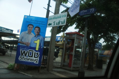 Mr.Panich Viktsreth (right in the picture), the candidate for Democrats is ‘exclusivley’ enjoying his election campaign for sunday’s by election as his prisoned competitor Mr. Korkaew has not been allowed to outdoor campaign nor accepted release on bail. There are critical voices questioning Pheu Thai party as to why the party nominated a ‘terrorism charged and jailed-person’ for its candidate. (© Lee Yu Kyung 2010)