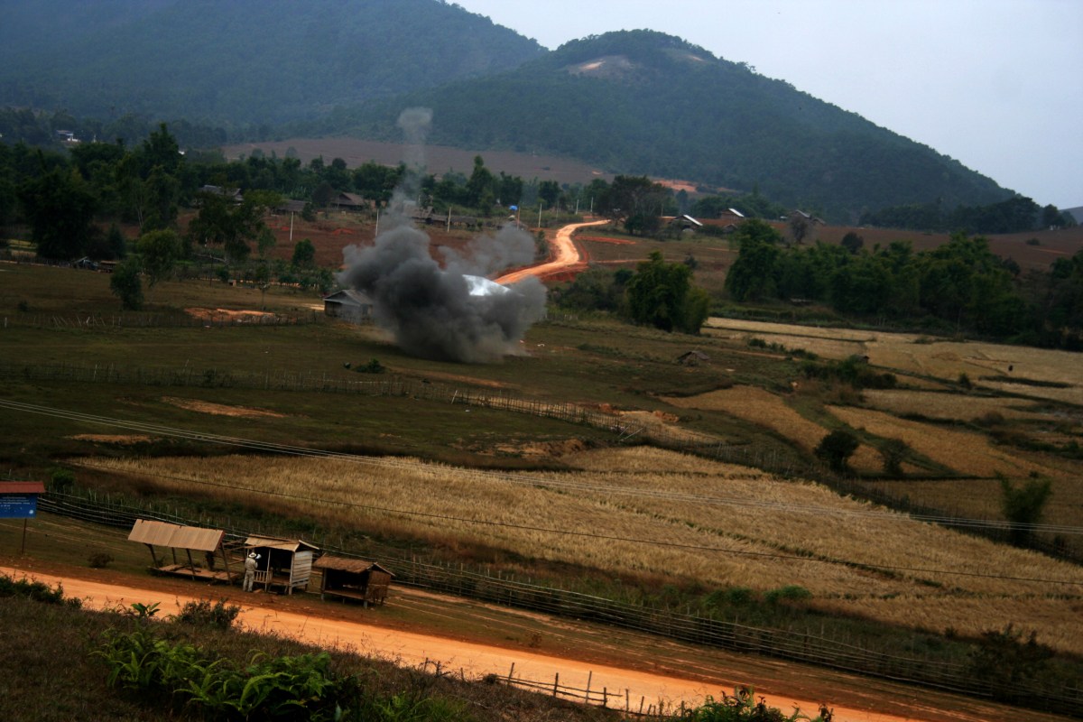 PortraitAsia.UXO(13) Published July 30, 2010 at 3456 × 2304 in 아시아의 얼굴, 아시아의 투쟁 – 집속탄/Portraits of Asia – Legacy of cluster bombs ← Previous Next → 정교하고 위험한 작업을 거쳐 마침내 불발탄이 터지고 있다. 밥비 (Bombie, 집속탄 알갱이) 6개가 날아가는 순간이다 (Photo @ Yu K. Lee)