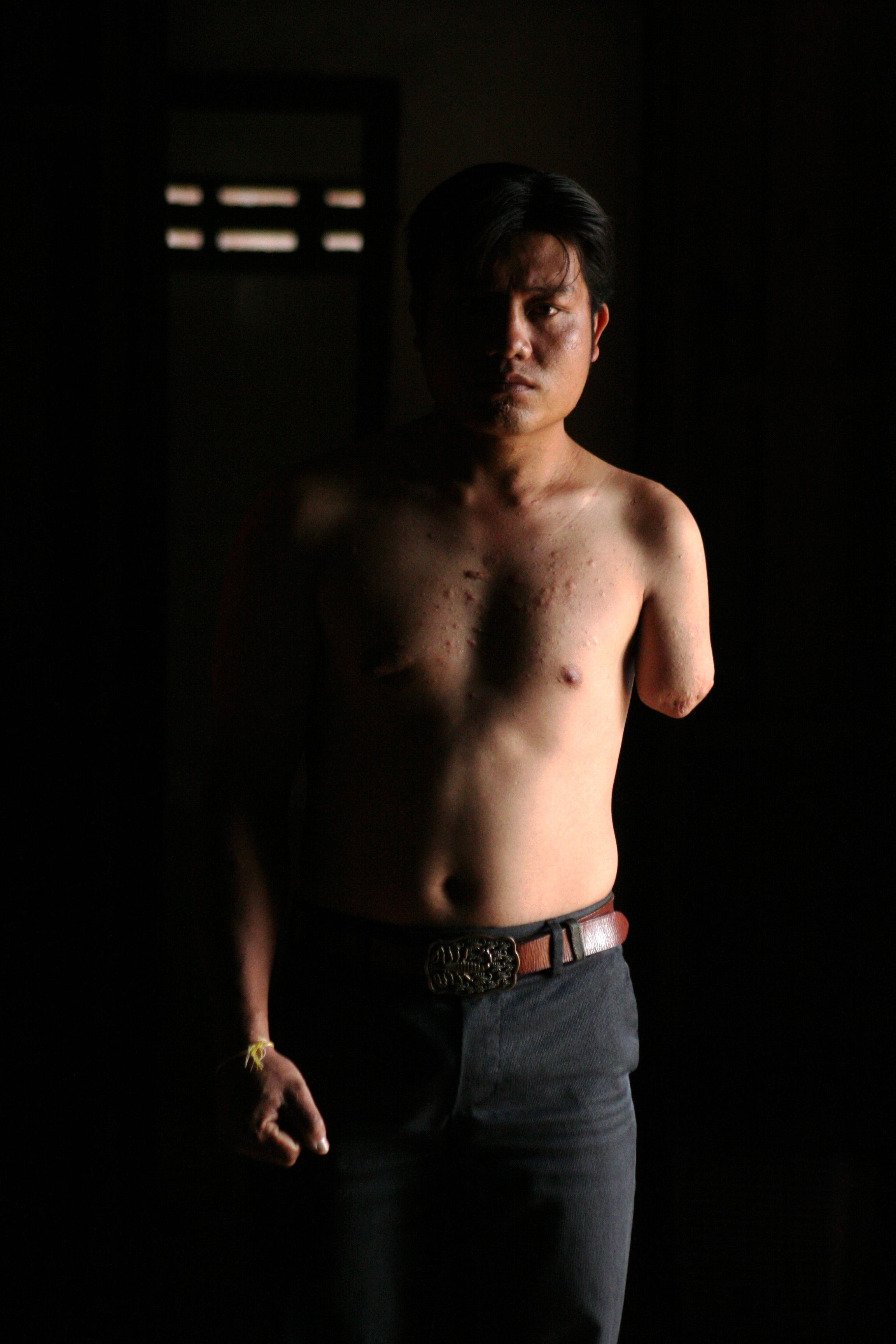 PortraitAsia.UXO(7) Published July 28, 2010 at 2304 × 3456 in 아시아의 얼굴, 아시아의 투쟁 – 집속탄/Portraits of Asia – Legacy of cluster bombs ← Previous Next → 분미 비자르(28)는 10년 전 연못을 파다가 1m 깊이에 도사리고 있던 집속탄 알갱이, 밤비(bombie)가 터지면서 팔 하나를 잃었다. “집속탄이 위험하다는 건 대강 알고 있었지만 그렇게 깊은 곳에 터지지 않은 탄이 있을 거라고는 상상도 하지 못했다”고 말한다. (Photo @ Yu K. Lee)
