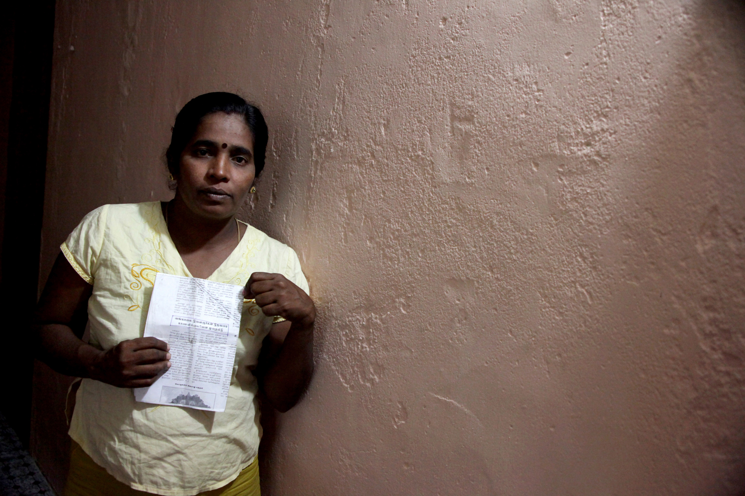 The 35 year-old Tamil woman shows report about her missing brother, who was last seen at the army check point in the North in 2007. She has lost her mother, sister and elder brother who all shot dead by Sri Lanka army in early 90s. Since the war in Sri Lanka has been resumed in 2006, thousands people – mostly Tamil youths – have disappeared. Some of them were last witnessed at the army checkpoint. (Photo @ Lee Yu Kyung)