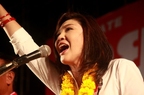 Yingluck Shinawatra posed at camera with supporters during her campaigning in Bangkok. She is seen as a proxy of the former Prime Minister Thaksin Shinawatra, who was ousted by 2006 military coup. (Photo by Lee Yu Kyung)