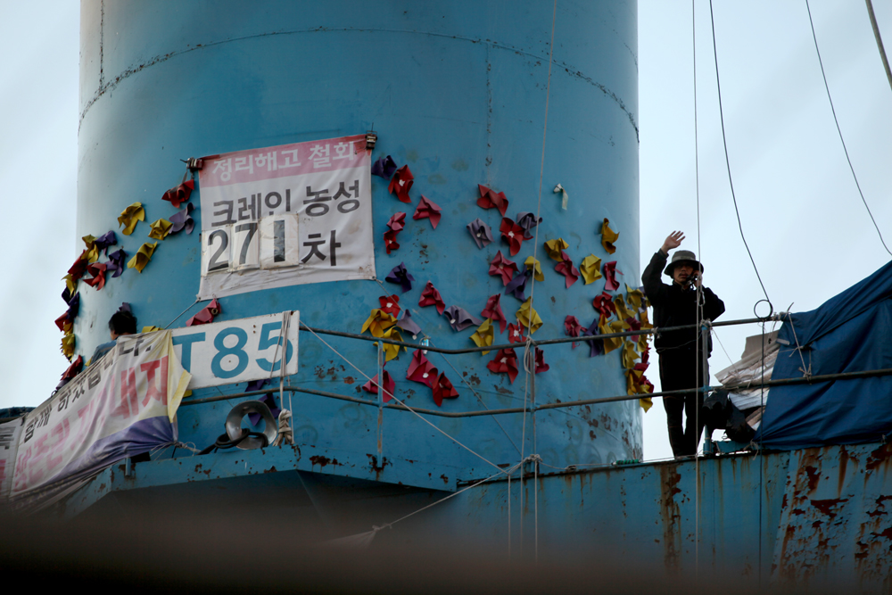 G_Hanjin_111003_(17)_SM Published October 28, 2011 at 1000 × 667 in Hope, Not Despair ← Previous Next → Park Young-Jae, one of the remained three workers at the mid point of the Crane No. 85 (Photo @ Lee Yu Kyung)