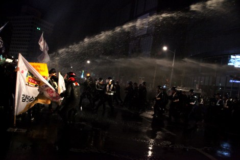 Als die Polizei gar Wasserwerfer gegen die »Hoffnungsfahrer« auffuhr, waren es Behinderte, die sich mit ihren Rollstühlen in die erste Reihe der Demonstranten stellten und sie schützten. (Foto @ Lee Yu Kyung)