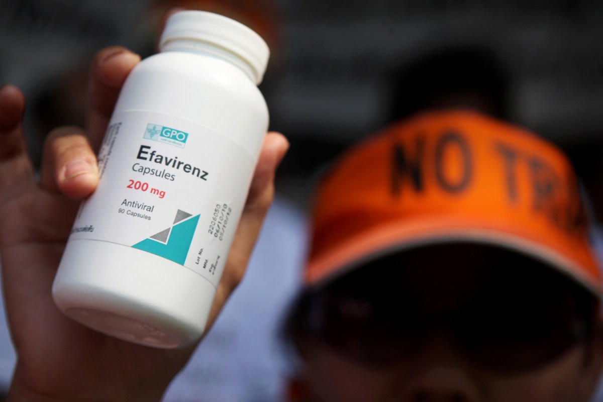 EU의 지적재산권 강화( ‘TRIPS 플러스’)에 반대하는 한 시위대가 자신이 복용하고 있는 Efavirenz약통을 들어보이고 있다. 에이즈 치료제로 광범휘하게 사용되는 Efavirenz는 2006년 11월 타이정부의 강제 실시 (Compulsory Licence)권 발동으로 GPO 에서 생산되고 있다. 일부는 인도에서 제네릭을 수입, 무료보급되고 있다. 강제 실시권은 TRIPS에 저촉되지 않는 WTO 회원국의 합법적 권리이다. (Photo by Lee Yu Kyung)