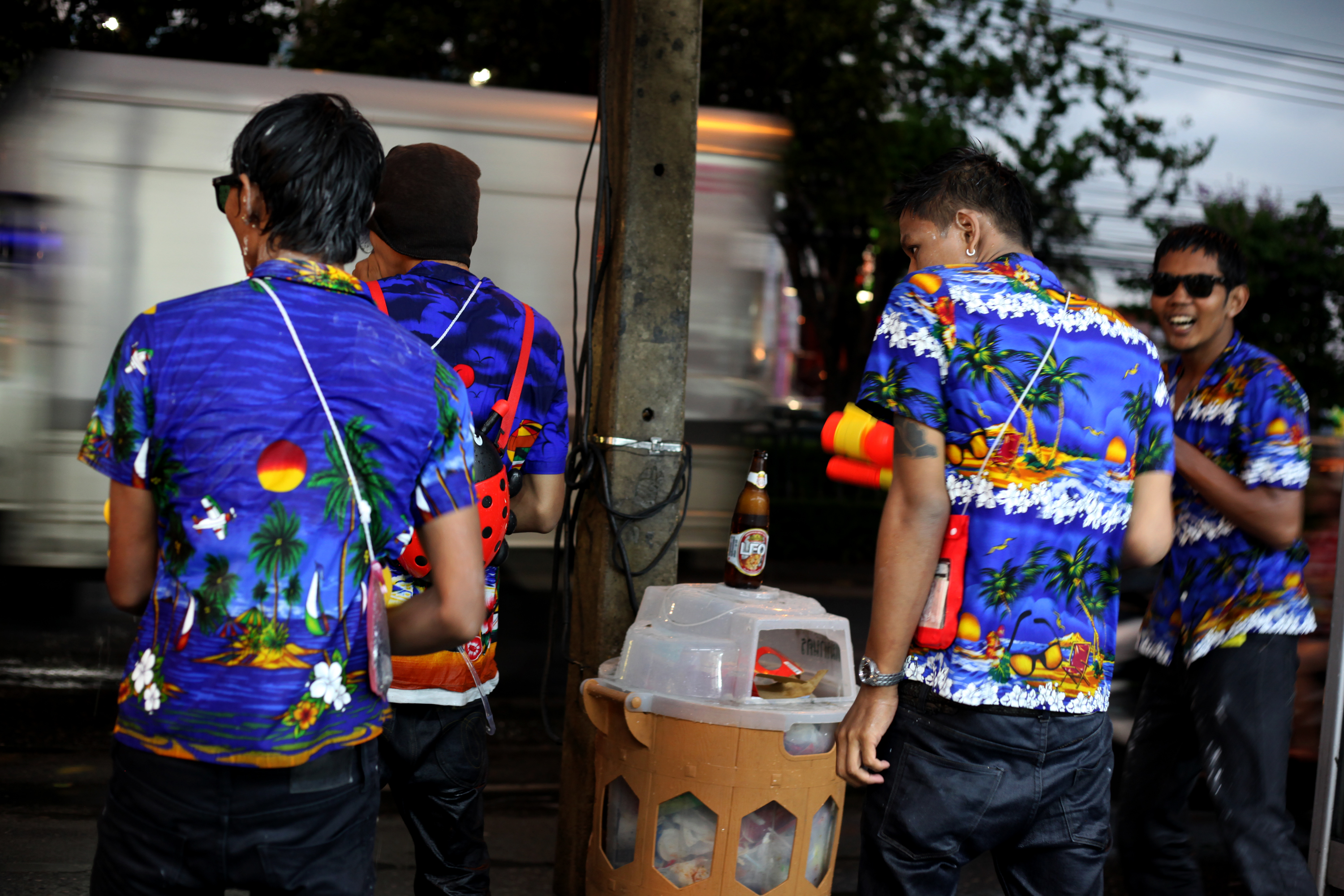 G_Drunken_BKK_130414_005_SM Published April 28, 2013 at 3000 × 2000 in 방콕 ‘물바다’ ← Previous 송크란물축제기간 유니폼처럼 옷을 맞춰입은 젋은이들이 맥주 한모금과 물싸움을 병행하며 즐거워하고 있다. (Photo © Lee Yu Kyung)