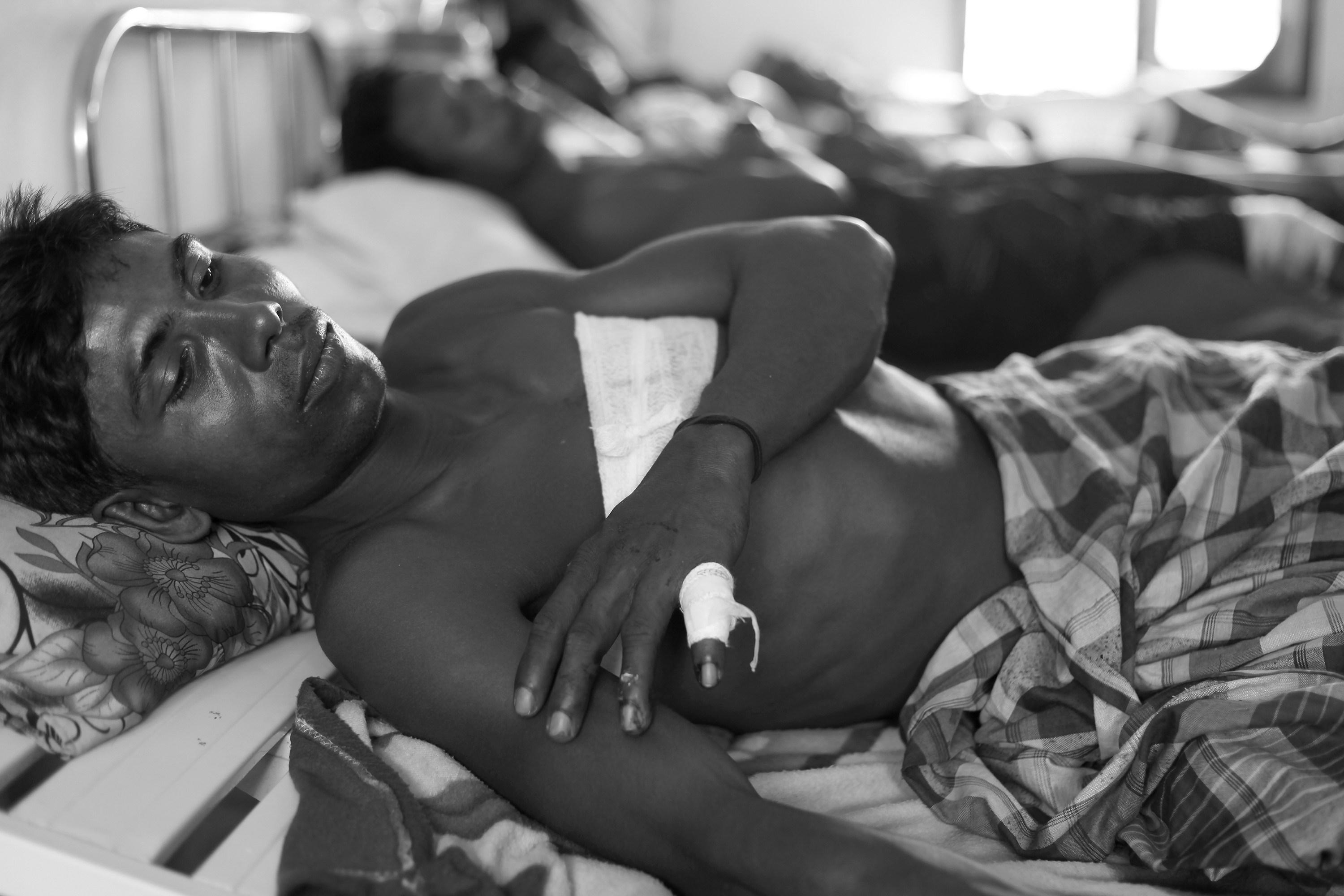 A Rohingya IDP lie down in Dapaing clinic located inside IDPs camp. He’s got injured as police forces in Ohn Daw Gyi and Baw Du Paw camps have shot at crowd resulting in a few deaths and a dozen injured on Auguest 9. Some security forces and Hlun Tin (riot police) inside the camp are said to be elements of former Nasaka (or border guard force in Western Burma) which were officially disbanded in July. Muslims IDPs almost unanimously said they are afraid of more ‘police’ than the ‘army’. (Photo © Lee Yu Kyung 2013)