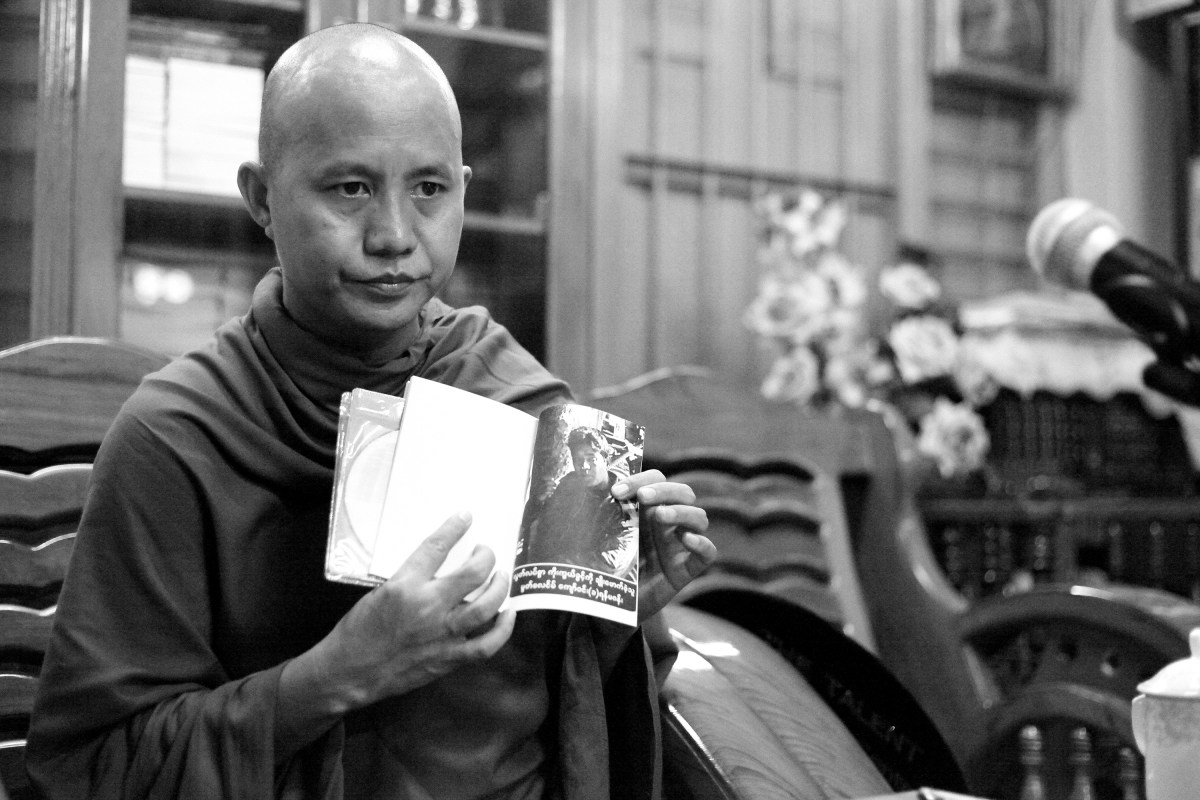 U Wirathu, the monk leading the Buddhist extremist 969 movement showed a picture of a Muslims man, who U Wirathu claimed, committed domestic violence against his Buddhist wife. He has advocated that Buddhist women should not married to Muslims men. (Photo © Lee Yu Kyung 2013)