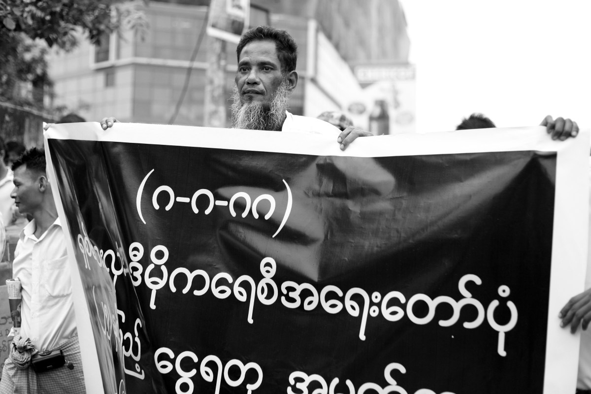 Dozens of Rangoon citizens have marched through the city on the occasion of the 25th anniversary of the 88 Uprising. They’re not happy with the fact that 88 Generation, the main organizer of the ceremony, has invited government, who the protesters saw culprits of the brutal crackdown 25 years ago. Instead, this handful of people have demanded former and current generals apologize. (Photo © Lee Yu Kyung 2013)
