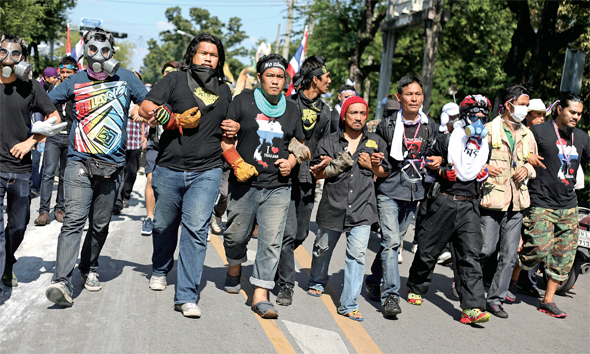138690827979_20131214 Published December 29, 2013 at 590 × 354 in 다시 드리운 쿠데타의 그림자 Next → 타이 방콕에서 스크럼을 짠 반정부 시위대가 총리 공관 쪽 으로 행진하고 있다. 잉락 친나왓 총리가 정국 수습을 위해 내놓은 ‘의회 해산-조기 총선’ 카드를 거부한 이들은 국왕 이 임명하는 총리와 임명직들로 구성된 ‘인민위원회’ 설립 을 요구하고 있다. (Photo © Lee Yu Kyung 2013)