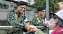 138690837653_20131214 Published December 29, 2013 at 590 × 319 in 다시 드리운 쿠데타의 그림자 ← Previous Next → 국왕 생일을 앞두고 극적인 휴전이 이뤄진 가운데, 왕정을 지지하는 반정부 시위대가 군인과 악수하고 있다. 군이 자기들 편이라는 왕정주의자들의 믿음은 견고하다. (Photo © Lee Yu Kyung 2013)