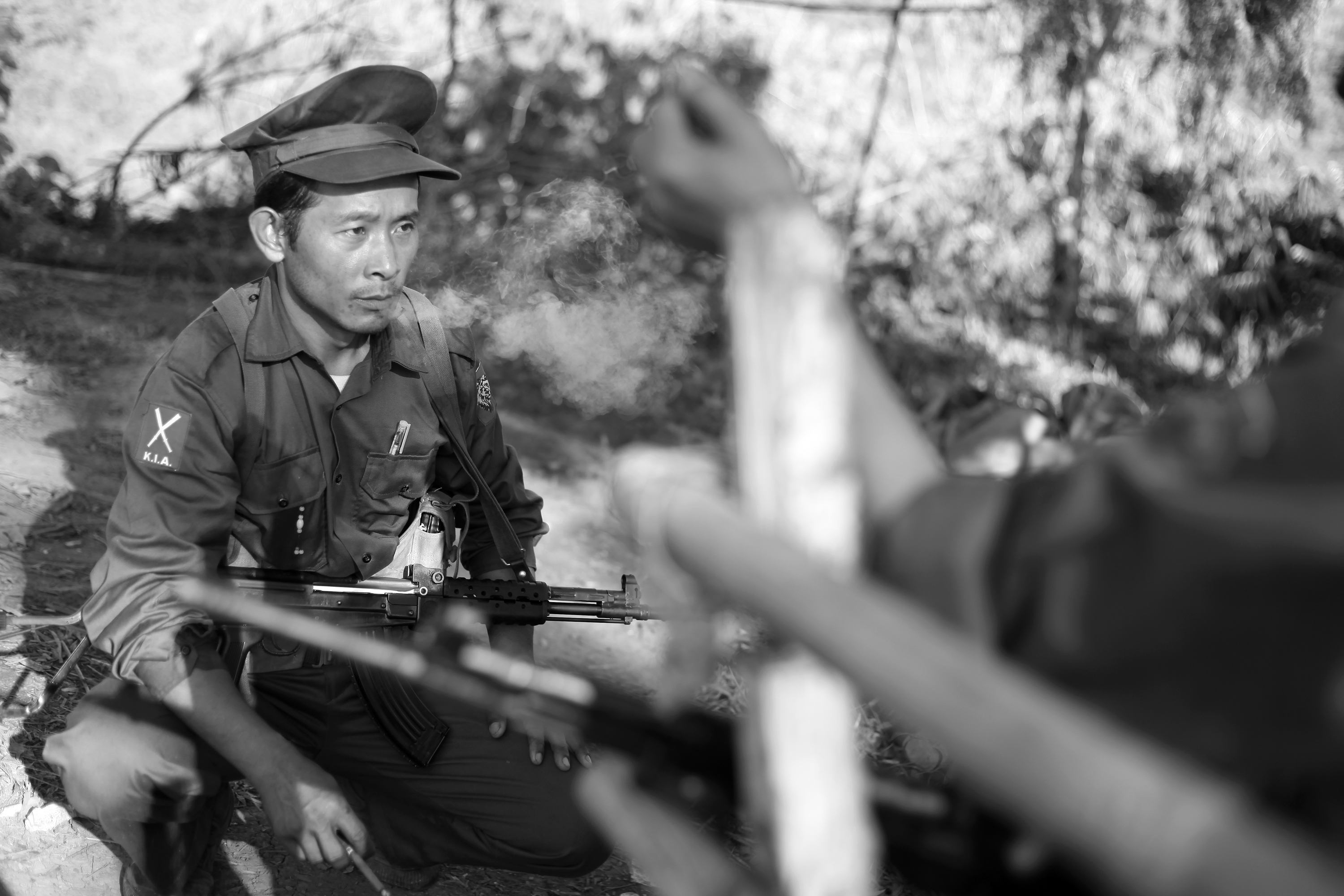 G_KIA_Frontline_131112_0209_SM Published September 6, 2014 at 3000 × 2000 in Peace Process, lost in the Jungle (B/W) ← Previous Next → A KIA solider at the Lawayang frontline, 8 km off from Laiza – the rebel’s capital in Kachin state. (Photo © Lee Yu Kyung)
