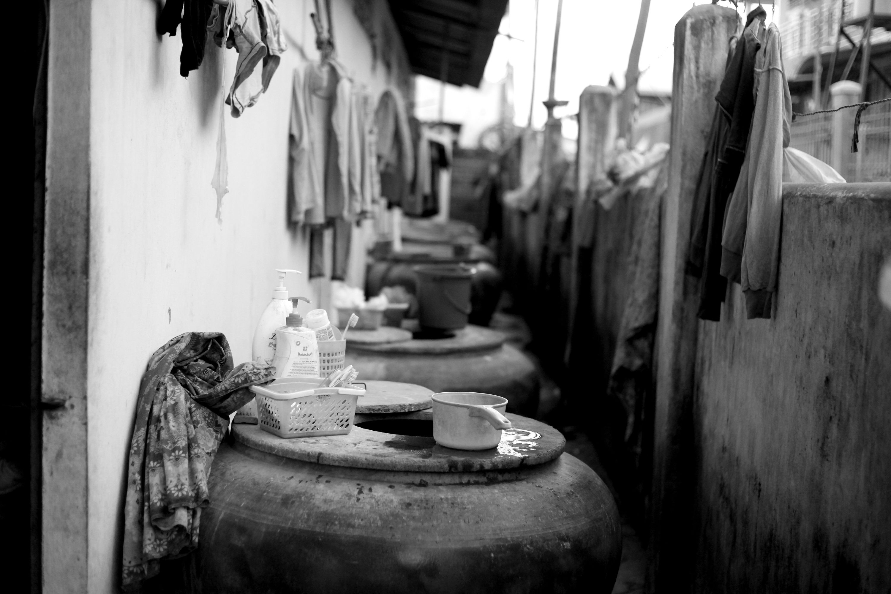 G_Cambodia_Strike_140113_0123_SM Published February 1, 2014 at 3000 × 2000 in 기업의 앙탈에 총알이 발사되었다 ← Previous Next → 프놈펜 남서쪽 카나디아 공단 부근 월세 25달러짜리 거처 벽면. 화장실이나 세면시설은 따로 없으며 벽을 끼고 늘어선 큰 항아리에 물을 담아 요리, 세면 등을 해결한다. (Photo © Lee Yu Kyung 2013)