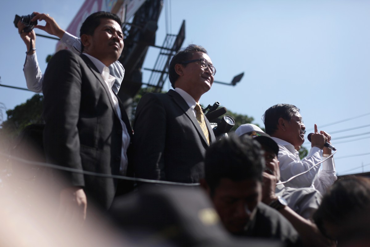03_G_Cambodia_Strike_140114_0049_SM Published February 1, 2014 at 3000 × 2000 in “독재정부도 마다 않는 한국 투자자들 변해야” 삼랭시, 캄보디아 구국당 (CNRP) 대표가 지난 1월 14일 프놈펜 지방 법원의 조사를 받고 나온 뒤 지지자들 앞에섰다. (Photo © Lee Yu Kyung 2014)