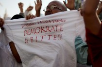 “Dictator, No thank you. Democracy, yes please” Opposition supporters in Cambodia are chanting anti-government slogans in front of the Phnom Penh Court on January 14, as the country’s opposition leader Sam Rainsy would appear for court hearing. Sam Rainsy, along with his deputy and one unionist, is accused of “inciting civil unrest” during the recent workers’ strike. The strike was violently crack downed by elite paratrooper 911 forces and military police. (Photo © Lee Yu Kyung)