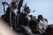 After having been questioned for hours, Cambodia’s opposition leader Sam Rainsy appears before crowd on January 14. He, along with his deputy and one unionist, is accused of “inciting civil unrest” during the recent workers’ strike, which was violently crack downed by elite paratrooper 911 forces and military police. (Photo © Lee Yu Kyung)