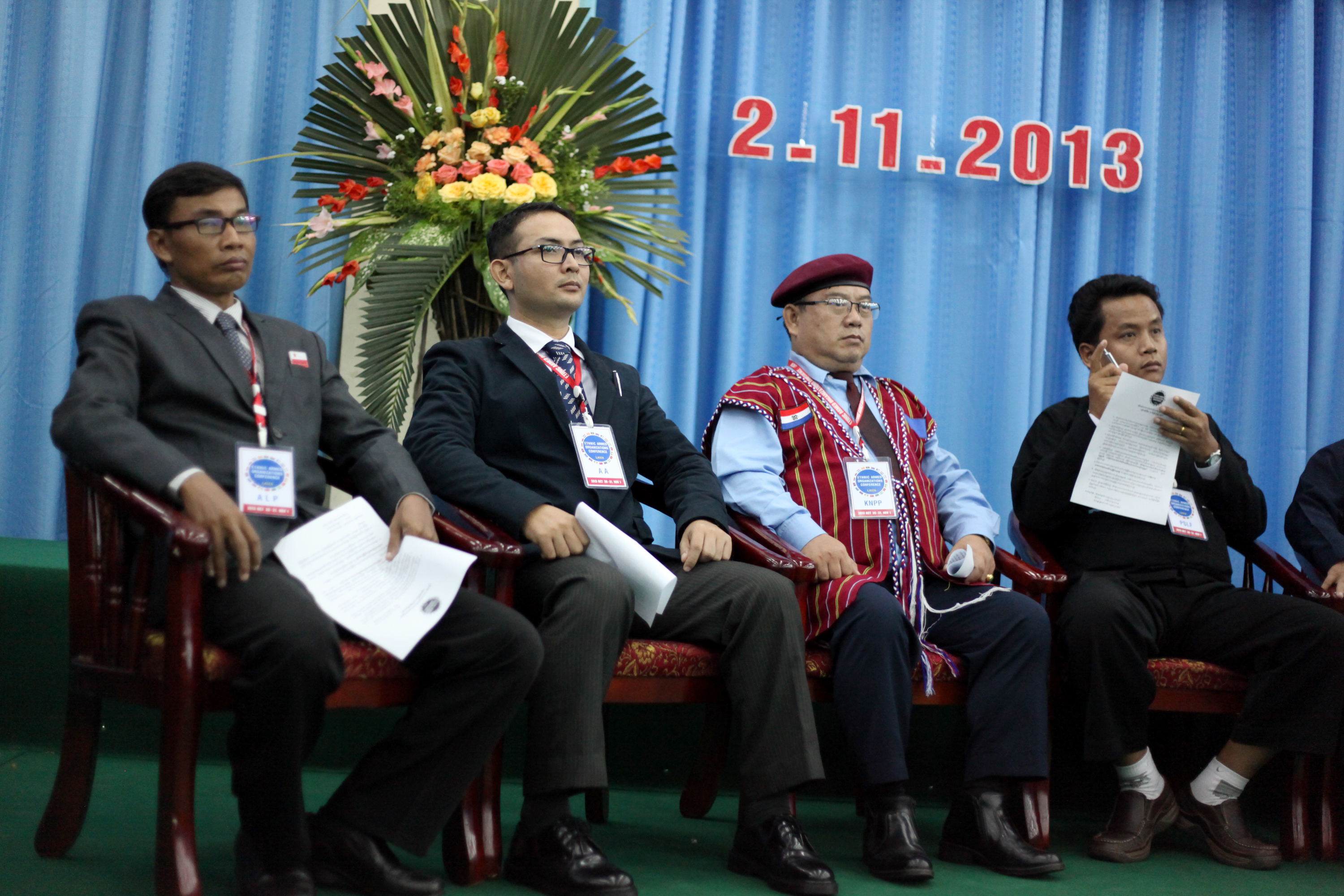 G_EthnicConference_131102_0304_SM Published June 12, 2014 at 3000 × 2000 in “5%라도 그들의 존재는 암덩어리” ← Previous 지난해 말 카친주 반군 수도 라이자에서 열린 전소수민족무장단체 회의에서 아라칸해방당(ALP) 카잉 투카 사무총장(맨 왼쪽)과 아라칸군 최고 사령관 트완므왓나잉 준장이 나란히 앉아 있다. 라카잉 무장단체 중에서 반로힝야 인종주의 성향이 가장 강한 이 두 조직은 현재 통합 협상을 진행 중이다 (Photo © Lee Yu Kyung)