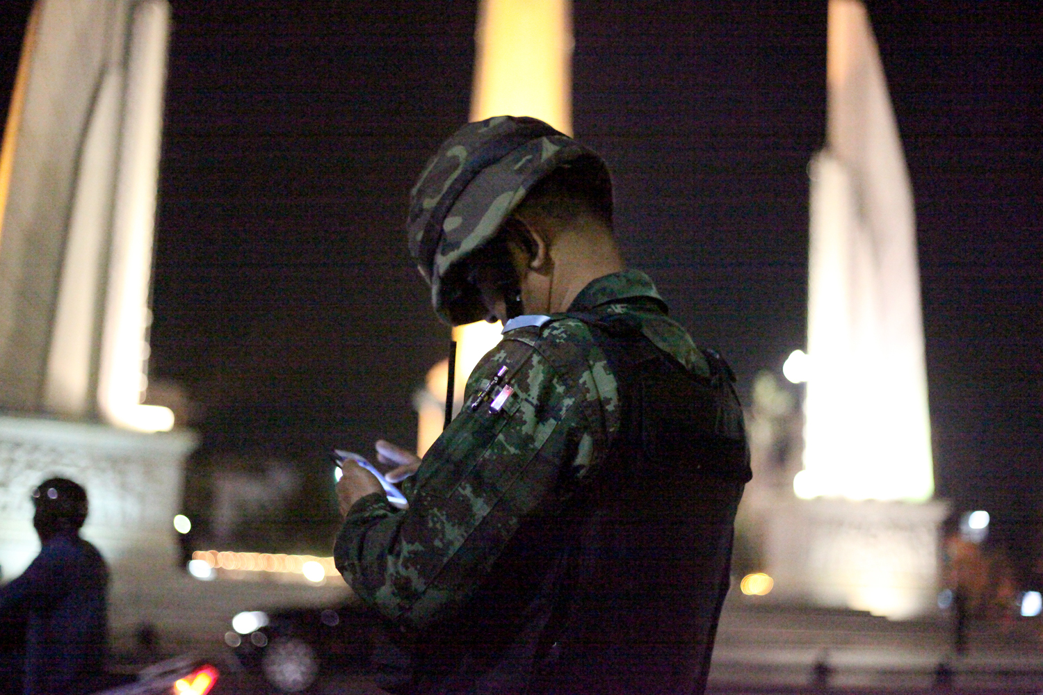 A soldiers near Democracy Monument in Bangkok was checking Social Network System (or SNS) as there’s attempt for gathering by handful of activists to support for students, who were arrested days ago for ‘three finger salute’ at the cinema screening ‘Hunger Game’. Three fingers salute has become a symbol of resistance against authoritarian rule in Thailand. And now it’s banned. (© Lee Yu Kyung 2014)