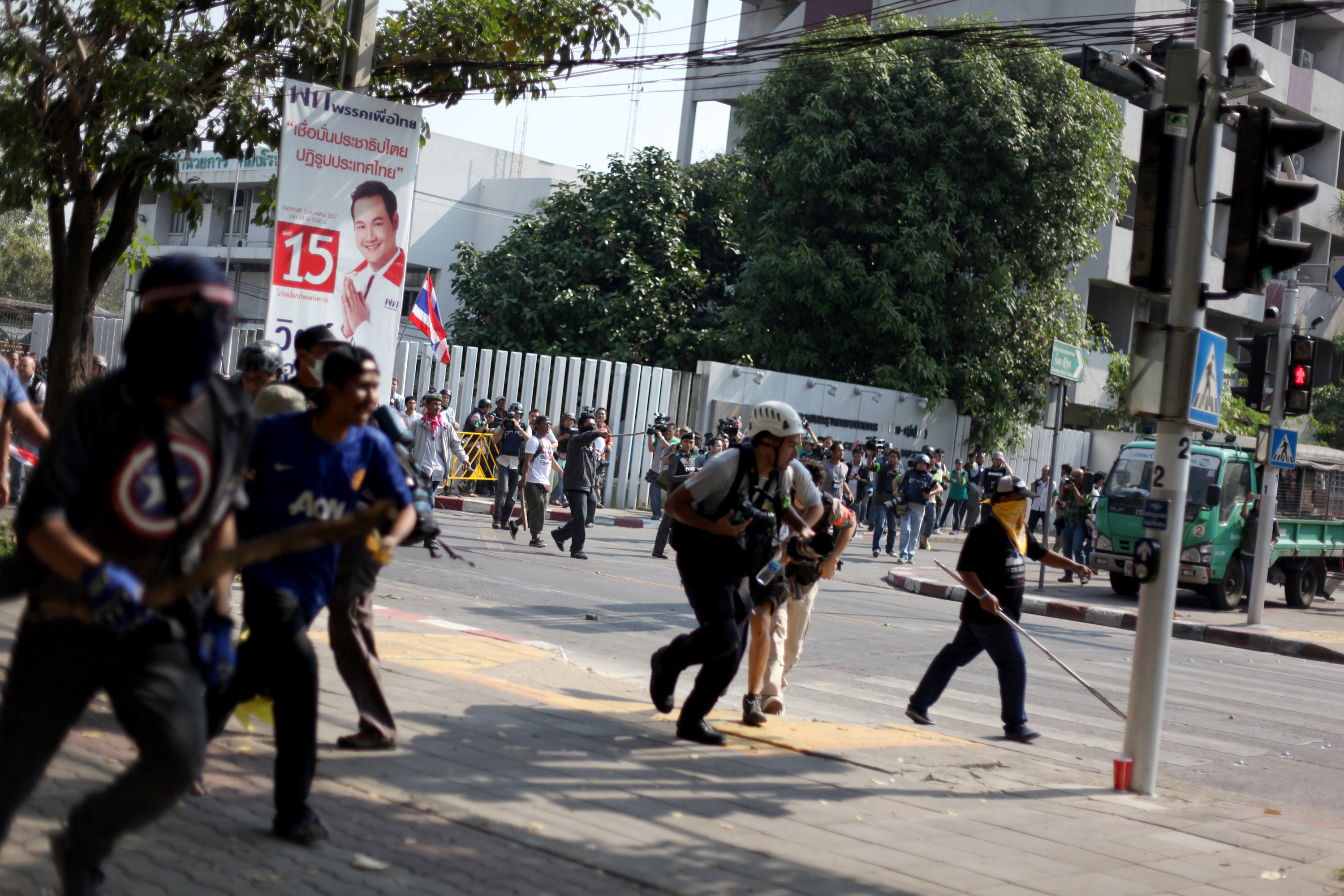 Activists from PDRC (People’s Democratic Reform Committee) – latest version of “Yellow Shirts” were yelling and threatening at dozens of residents who were trying to walk towards polling station on February 2nd in Bangkok. PDRC’s 7 months long- occupation on the street of Bangkok has been led to Military coup on May 22. (Photo © Lee Yu Kyung 2014)