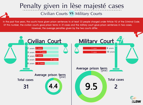 PenaltyLeseMajeste_by_iLaw Published January 25, 2015 at 600 × 442 in Apparent calm in ‘Thai District’ ← Previous On average military courts have passed out jail sentences for lese majeste twice as high as civilian courts. (Courtesy : iLaw)