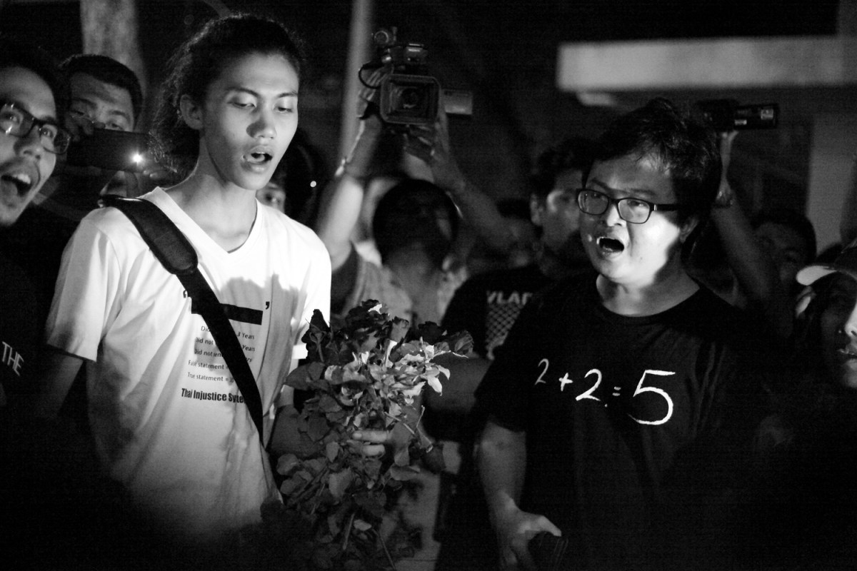Student activists and human rights lawyer together sang a song at a small gathering near Democracy Monument on November 23. Students were among those who were arrested ‘three finger salute’ at the cinema screening ‘Hunger Game’ in November. Three fingers salute has become a symbol of resistance against authoritarian rule in Thailand. And now it’s banned. (Photo © Lee Yu Kyung 2014)