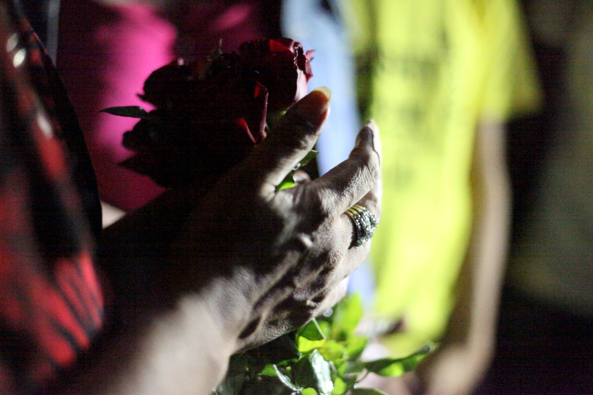One of the participants holding rose to support for students, who were arrested days ago for ‘three finger salute’ at the cinema screening ‘Hunger Game’. Three fingers salute has become a symbol of resistance against authoritarian rule in Thailand. And now it’s banned. (Photo © Lee Yu Kyung 2014)