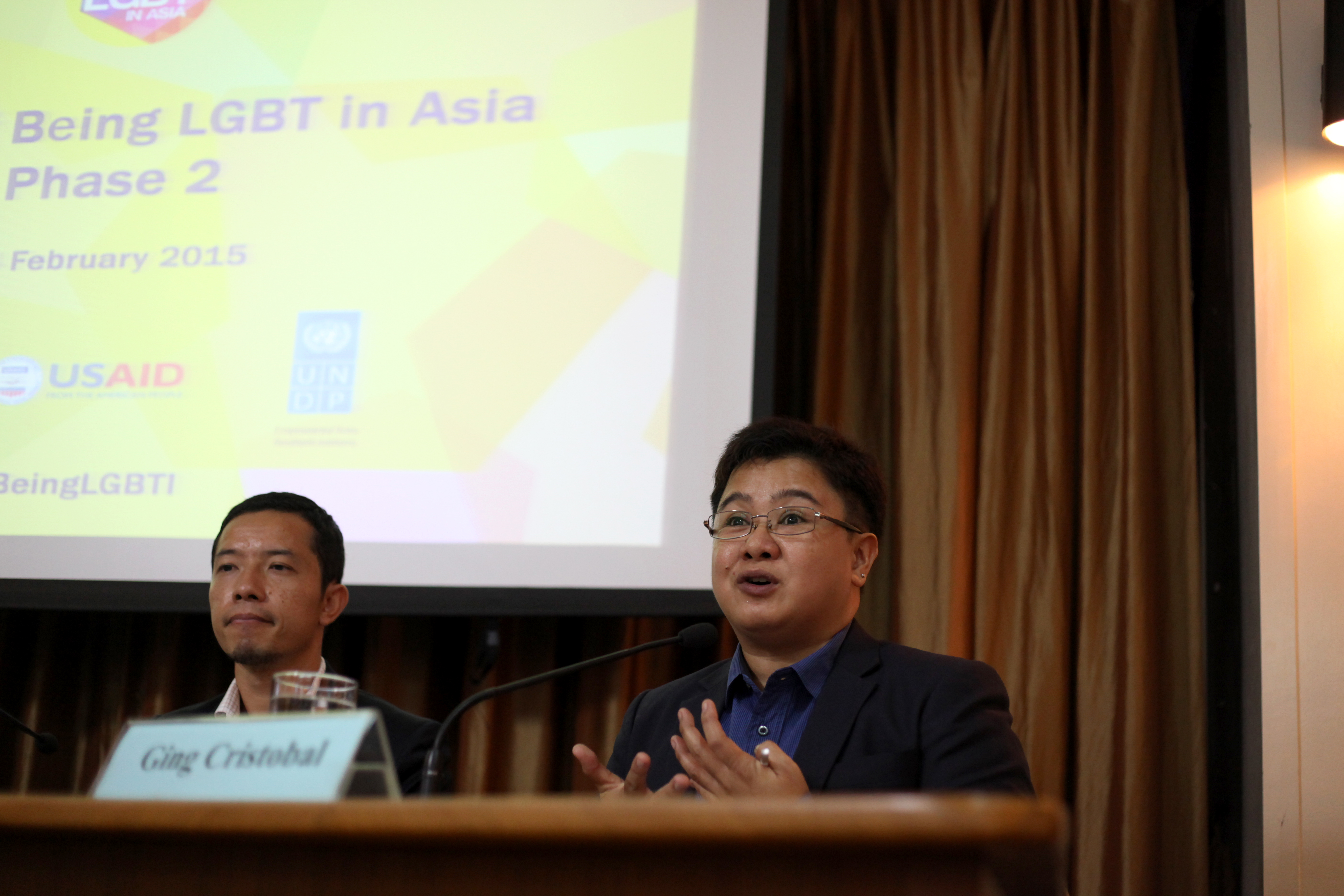 G_BeingLGBT_Asia_0077 Published May 24, 2015 at 5616 × 3744 in 동성 파트너십, 봄바람은 불어도 ← Previous Next → 필리핀 레즈비언 활동가인 깅 크리스토발(사진 맨 우측)이 방콕 기자회견 장에서 발표 중이다. 그는 카톨릭 영향력이 강한 필리핀에서 종교단체가 성소수자 행사를 방해하는 사례가 잦다고 말한다. (© Lee Yu Kyung)