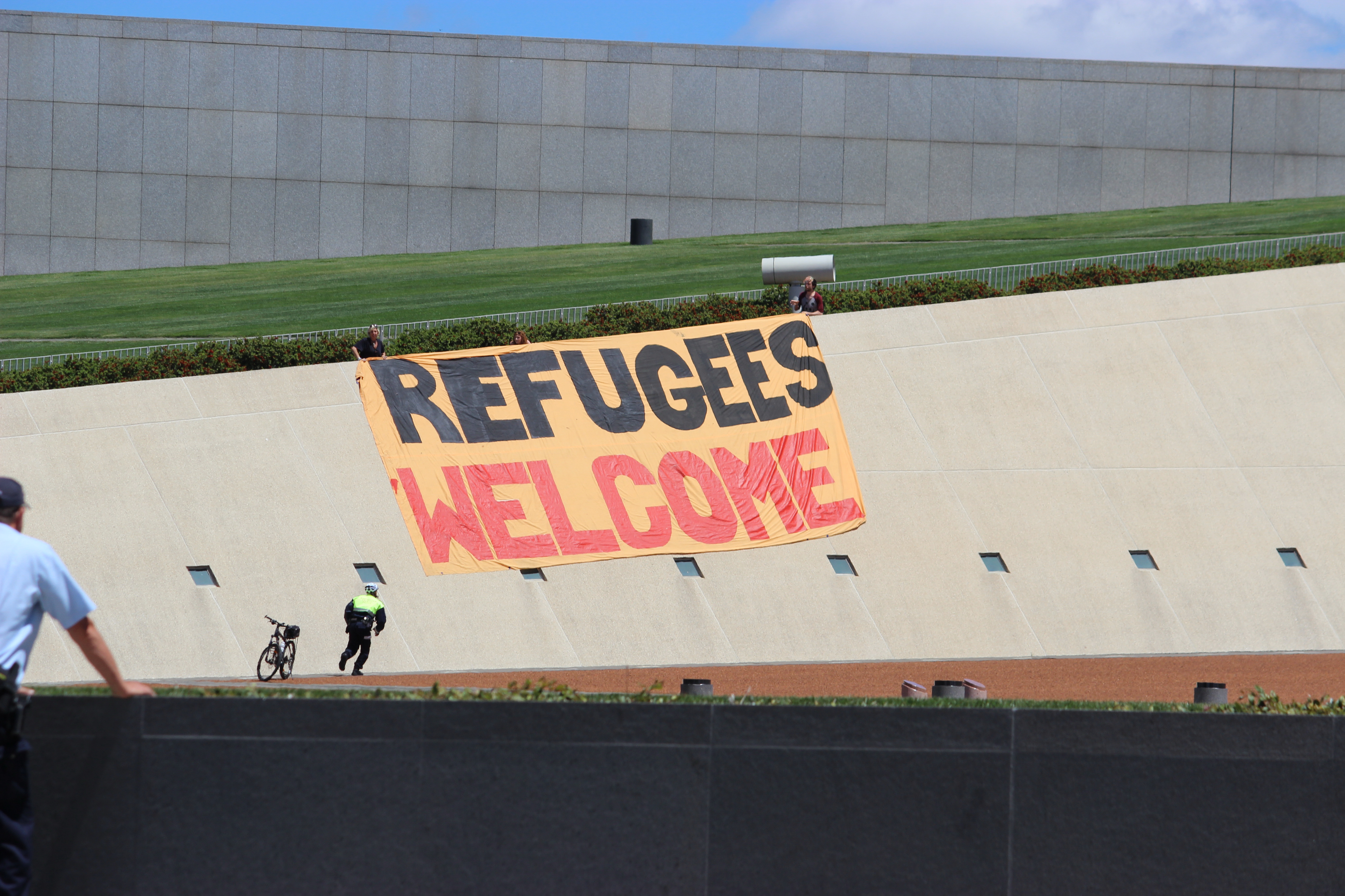 Photo_by_Peter Boyle_IMG_2057 Published May 30, 2015 at 5184 × 3456 in “너희 나라로 돌아가라고 지옥을 만들어놓았다” ← Previous Next → 2013년 호주 수도 캔버라 국회의사당 건물로 잠입한 난민운동가들이 건물 지붕에 “난민들을 환영한다”는 플랑카드를 거는 기습 시위를 벌이고 있다. (© Peter Boyle)