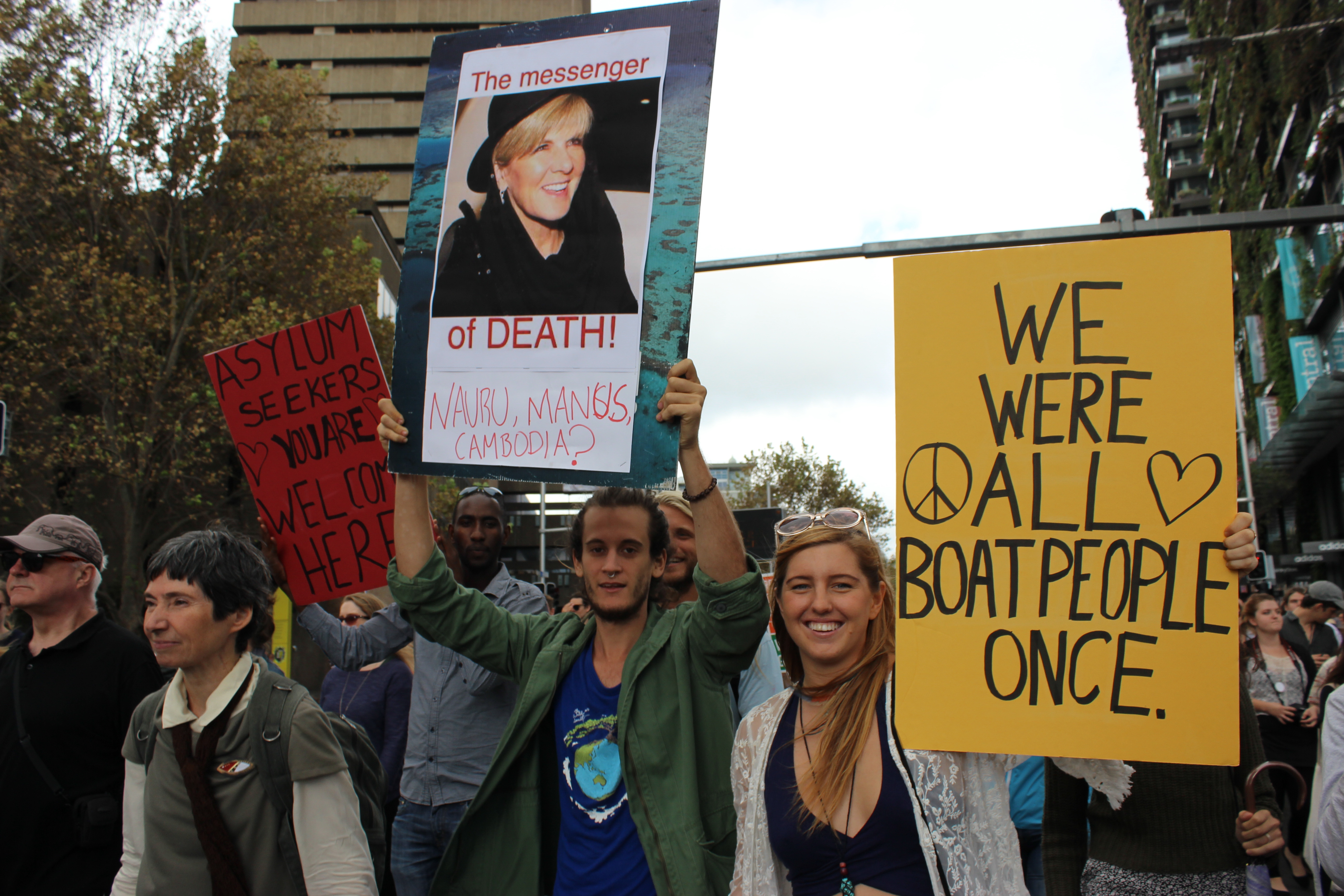 Photo_by_Peter Boyle_IMG_3302 Published May 30, 2015 at 5184 × 3456 in “너희 나라로 돌아가라고 지옥을 만들어놓았다” ← Previous Next → 지난 4월 19일 시드니 도심에서 벌어진 “난민 환영” 시위. 수천명이 참여했다. “우리 모두 보트피플이었다”는 피켓이 눈에 띈다. (© Peter Boyle)