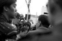 Rongsiman Rome, one of 14 student activists of New Democracy Movement was negotiating with police at the entrance of Pathumwan police station in Bangkok June 24. Students have filed charge against police for violent break-up of peaceful gathering on May 22, one year anniversary of the latest coup. (© Lee Yu Kyung 2015)
