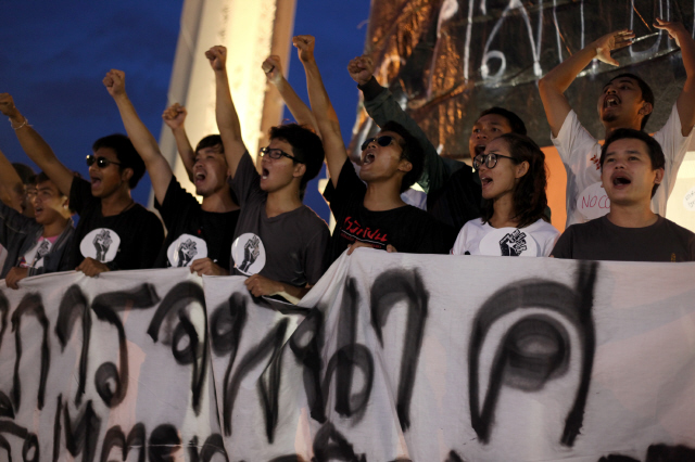 6001565751_20150713 Published August 7, 2015 at 640 × 426 in 저항이 말라붙은 땅, 단비 같은 외침 Next → 지난 6월25일 타이 방콕 민주탑에서 “군정 물러가라”는 구호를 외친 학생들. 이들은 5명 이상 집회를 금한 군정 명령 3호 위반은 물론 선동죄 혐의로 연행됐다. 현재 방콕 리멘트 감옥과 여성중앙교도소에서 군사재판을 기다리고 있다. (© Lee Yu Kyung 2015)