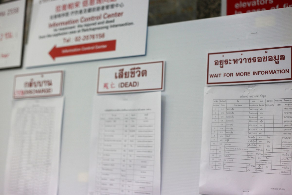 Again Never Again_Bangkok Blast Published August 26, 2015 at 2000 × 1333 in Again, Never Again ← Previous Next → Casualty board at Police Hospital, about 50 meters away from Erawan Shrine. (© Lee Yu Kyung)