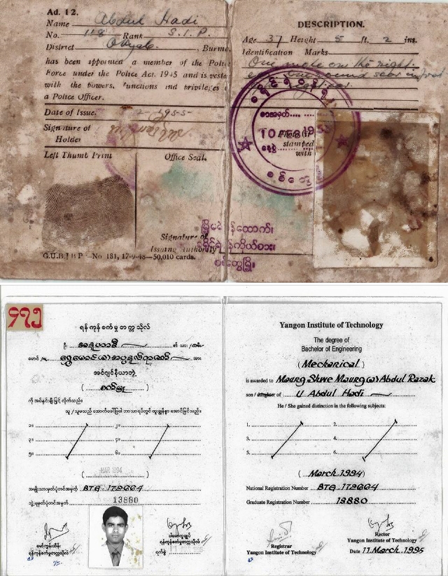 144180232234_20150910 (1) Published October 6, 2015 at 640 × 823 in 무슬림은 투표도 출마도 하지 마라 ← Previous Next → 로힝야 국회의원 우 쉐마웅은 출생 당시 부모가 시민권자가 아니었다는 이유로 이번 총선 출마 자격을 얻지 못했다. 1965년 아버지가 경찰관으로 근무 중이었음을 증명하는 경찰증을 아라칸주 선거관리위원회에 보여주었지만 이의신청은 기각당했다. 아래는 우 쉐마웅의 랑군공대 졸업증. 우 쉐마웅 페이스북