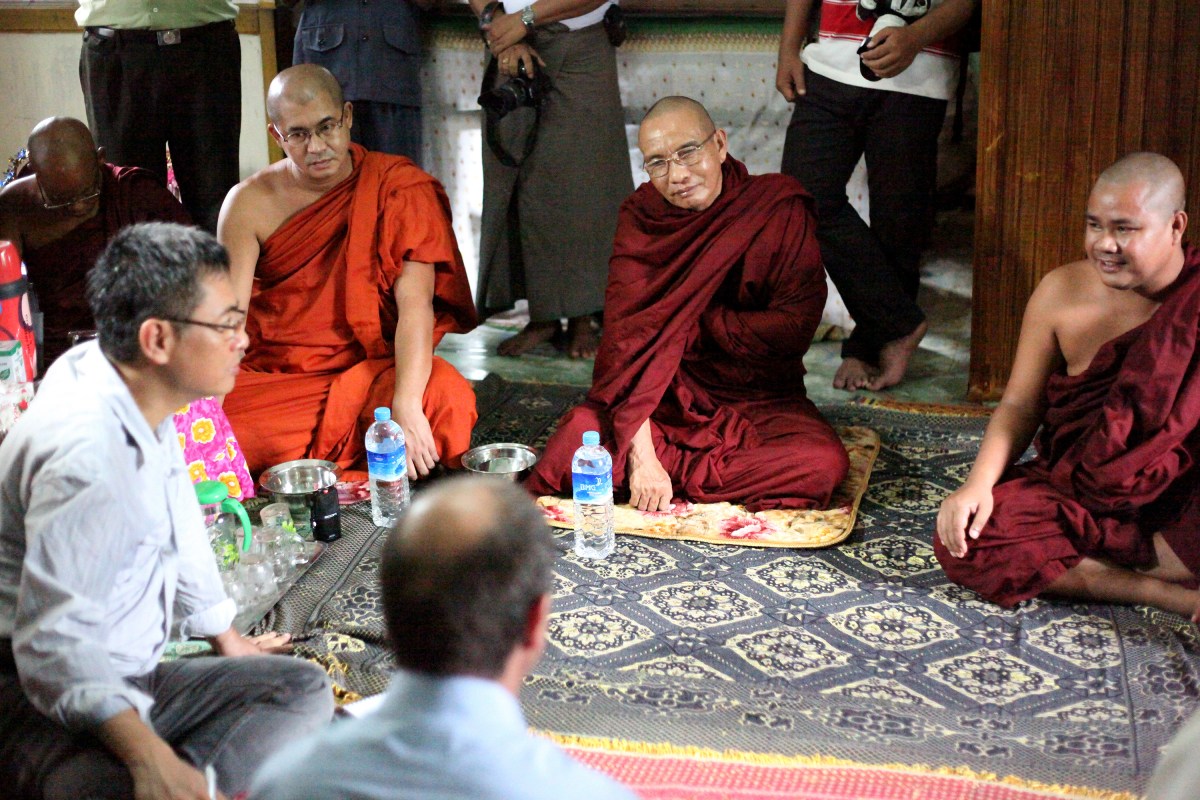 버마 아라칸 주 시뜨웨 시내에 자리잡은 쉐자디 사원 승려들이 2013년 당시 유엔버마인권보고관으로 현장 조사를 나온 토마스퀸타나 아르헨티나 인권변호사를 만나고 있다. 쉐자디 사원은 라까잉족 출신으로 대영식민정부에 저항했던 우 오타마 승려가 기거하던 사원이기도 하다. 간디 추종자였던 우 오타마의 대영투쟁은 식민정부에 납세거부운동과 같은 비폭력운동을 주로 벌여왔다. 오늘날 쉐자디 사원은 라까잉족들의 불교극우주의가 응집된 가장 상징적 구역이다. 이 사원의 승려들은 “벵갈리” (로힝야를 비하하는 말) 축출을 선두에서 외쳐왔다 (© Lee Yu Kyung 2016)