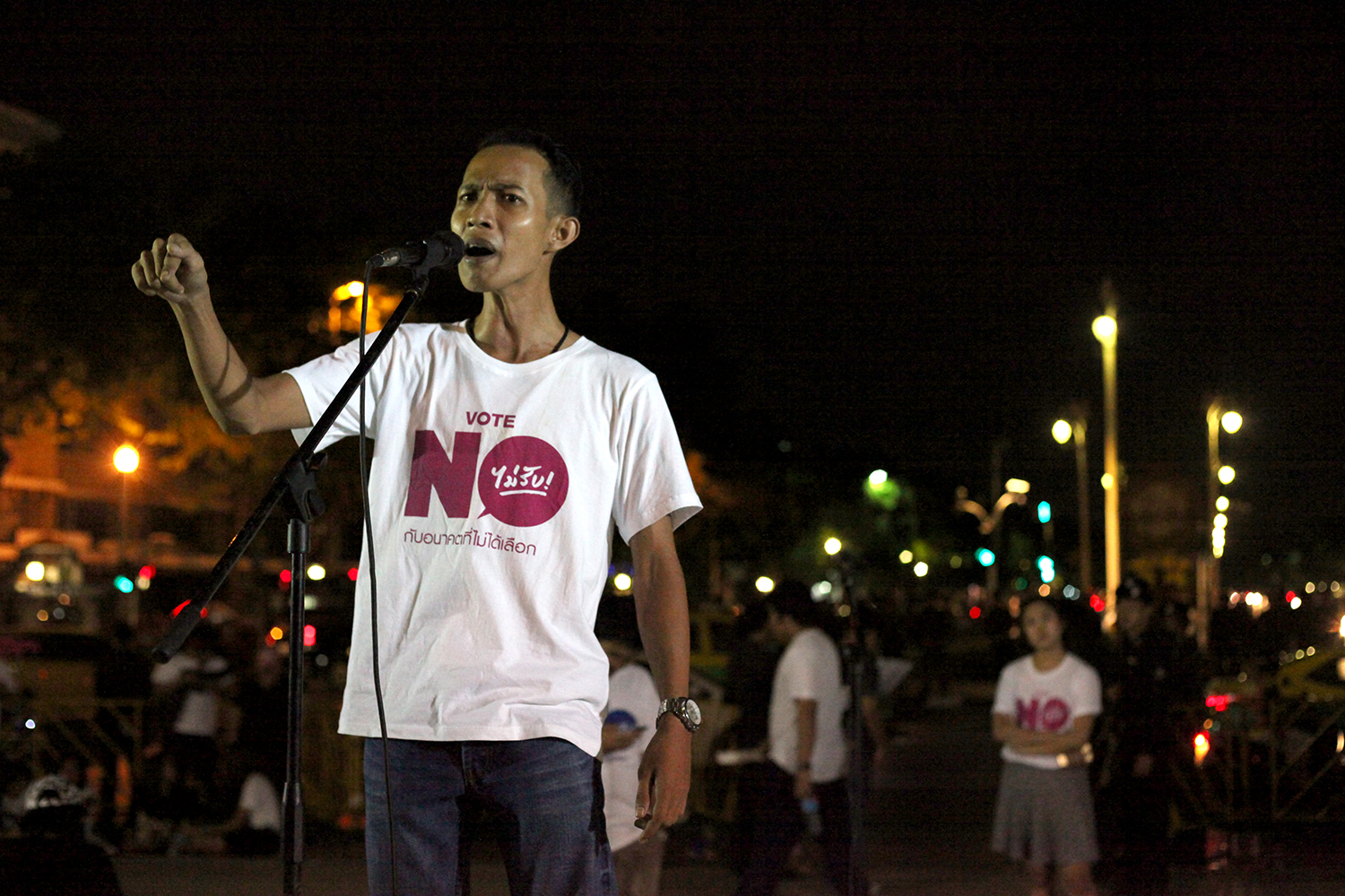 지난 5월 22일 쿠테타 2주년을 기념하여 방콕 민주탑에서 치뤄진 시위에서 신민주주의운동(New Democracy Movement, NDM) 소속 학생운동가들이 연설중이다. 시위는 전례없이 허용됐고 학생들이 주최했지만 중장년층의 참여가 두드러졌다. 2014년 쿠테타 이후 2년간 군사독재체제가 공고히 되고 있는 가운데 알려진 것만 200명이 망명길에 올랐고 군정의 고소고발이 남발하면서 표현의 자유는 크게 위축되고 있다. (© Lee Yu Kyung)