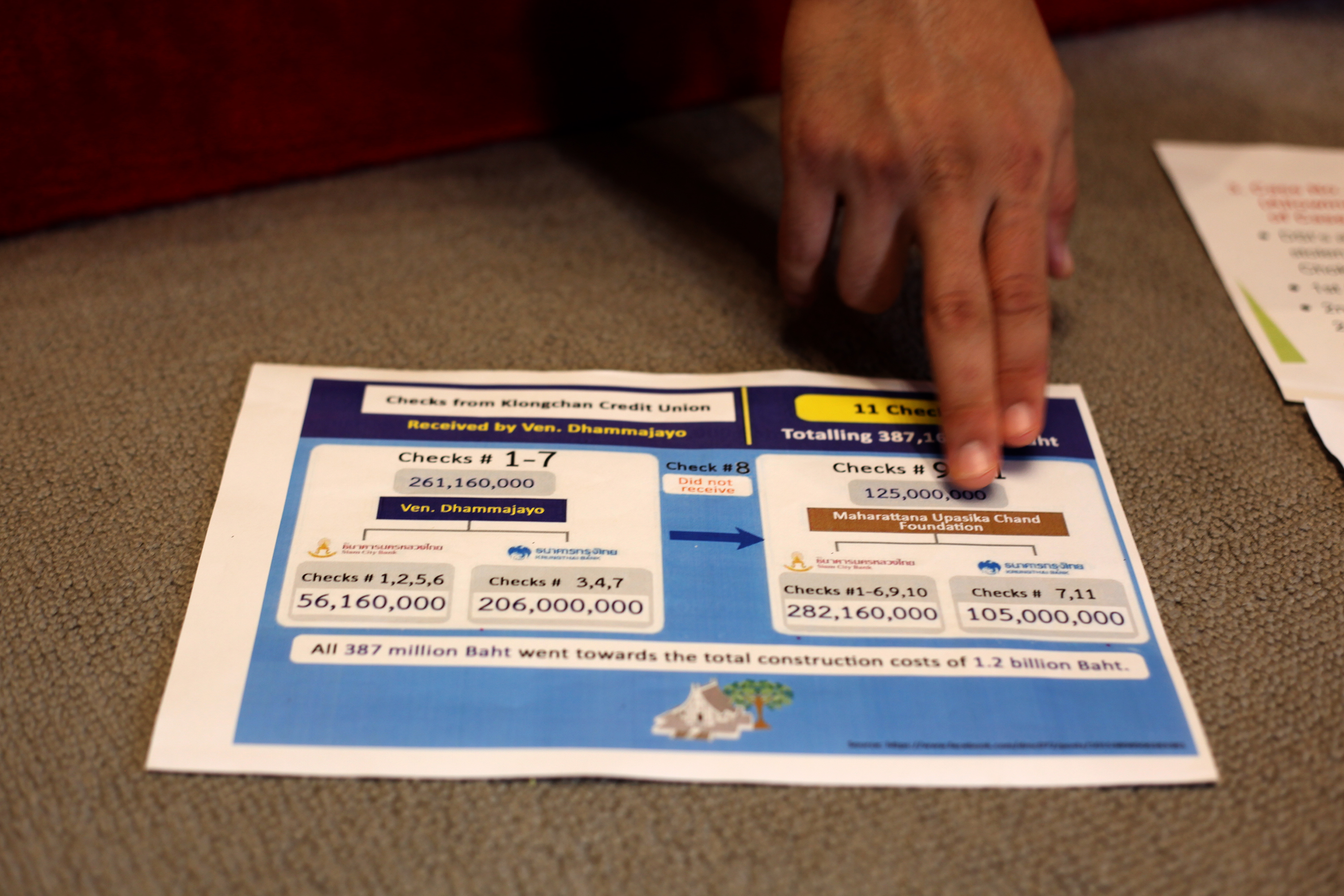 Dhammakaya Temple Published July 14, 2016 at 3000 × 2000 in 해탈을 ‘파는’ 타이 불교, 정교분리원칙마저 위태하다 ← Previous 담마까야 사원은 최근 언론팀을 강화했다. 오랫동안 대응하지 않은 탓에 부정적 이미지 확산되고 있다고 보고 있다. 사진은 주지승 담마차요에 대한 돈세탁 의혹과 관련 사원측이 그래픽자료로 설명하고 있다. (© Lee Yu Kyung)