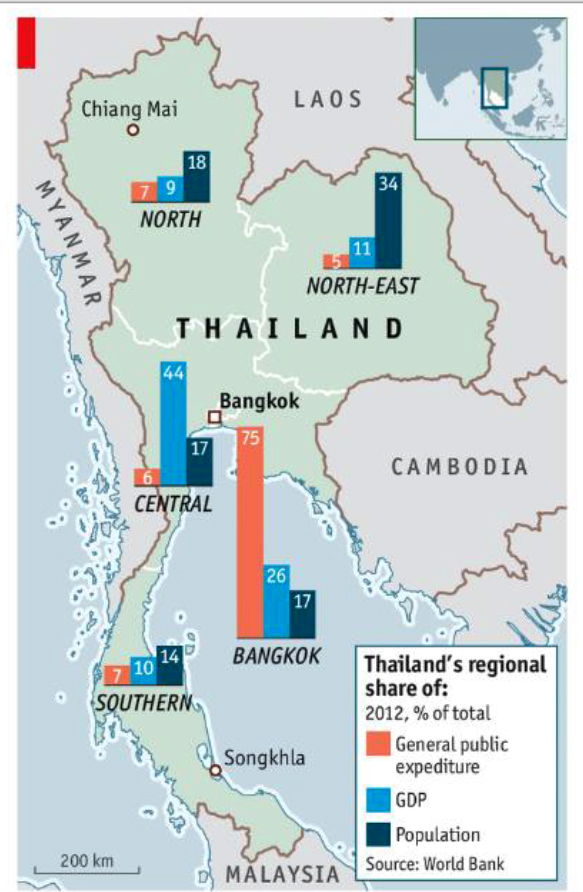10여년 넘게 이어지는 타이 정치분쟁은 지역을 변수로 계층 갈등의 요소가 잠재되어 있다. 세계은행이 2012년 발표한 그래픽은 방콕에 집중된 부의 편중과 국가예산의 불균형한 책정을 잘 보여준다. 방콕과 방콕 이남으로 널리 분포한 왕정주의 옐로우 셔츠는 반탁신 성향이 매우 뚜렷하다. 반면 인구가 밀집된 상대적으로 빈곤한 동북부와 북부 일대는 친탁신 정치세력이 지지를 받아왔고 레드셔츠 강성 지역이다. 그러나 쿠테타 이후 친탁신 정치권의 무기력한 대응은 레드셔츠내 분파를 더욱 촉발하고 있다. (Source : World Bank 2012)